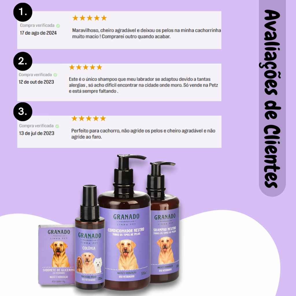 - Condicionador Neutro Granado: Promove brilho, maciez e hidratação intensiva com ativos condicionantes e manteiga de karité, para uma pelagem sempre impecável.