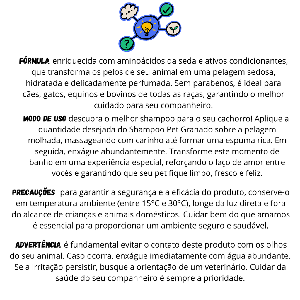 O melhor shampoo para seu cachorro! Aplique a quantidade deseja do seu shampoo Pet Granado sobre a pelagem molhada, massageando até produzir espuma. Em seguida, enxágue abundantemente.
